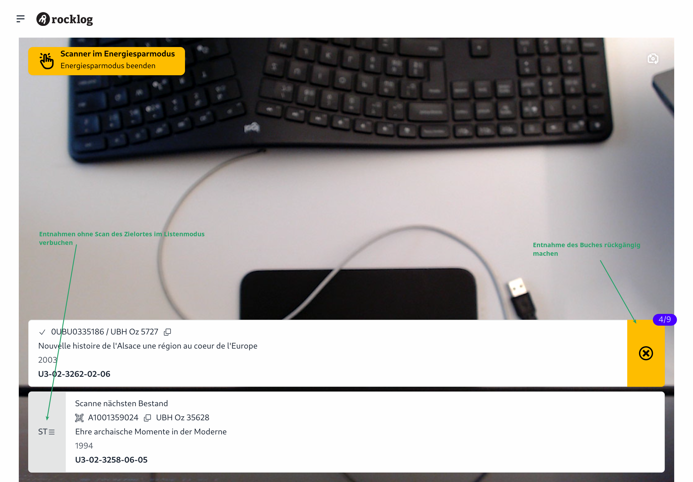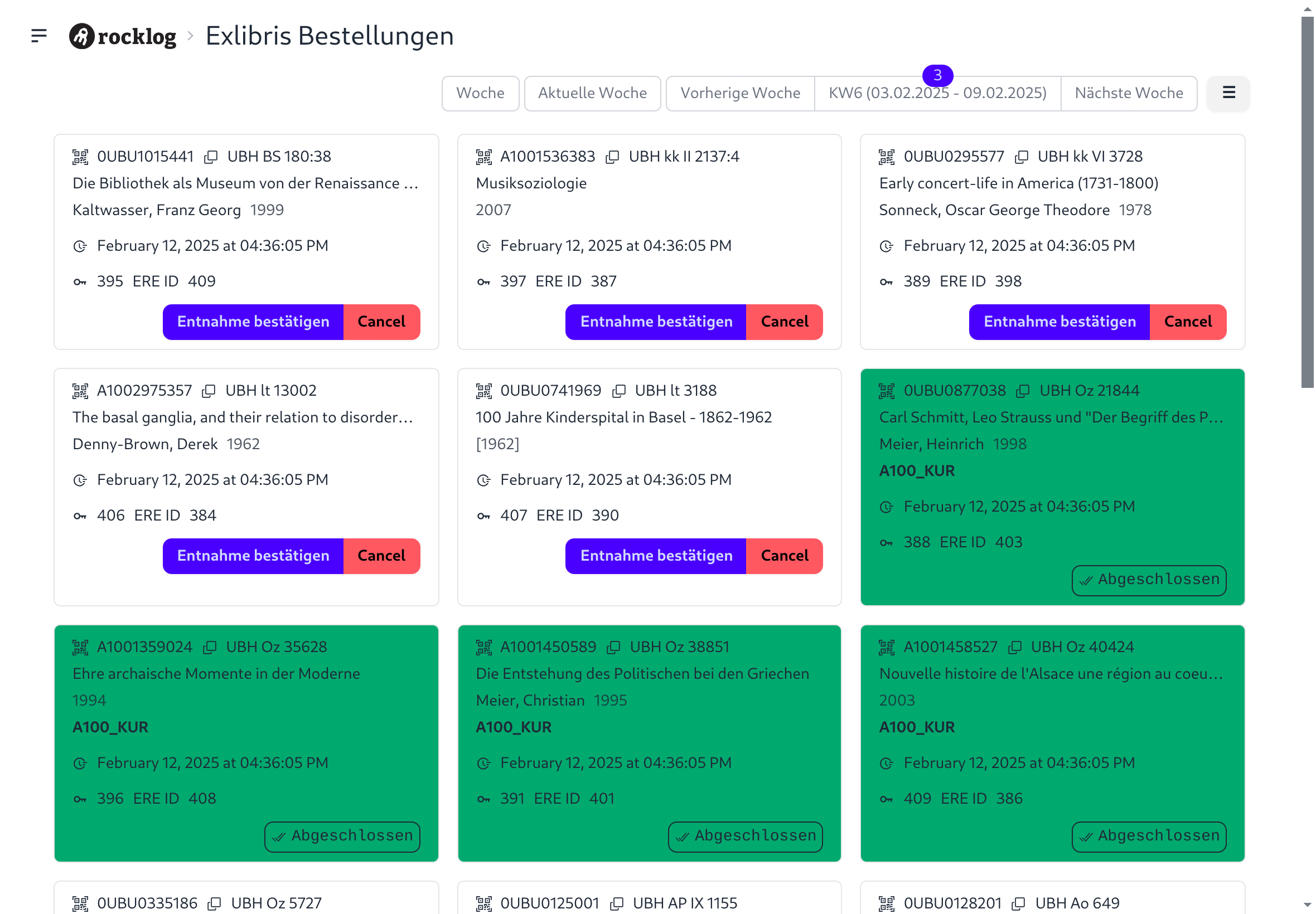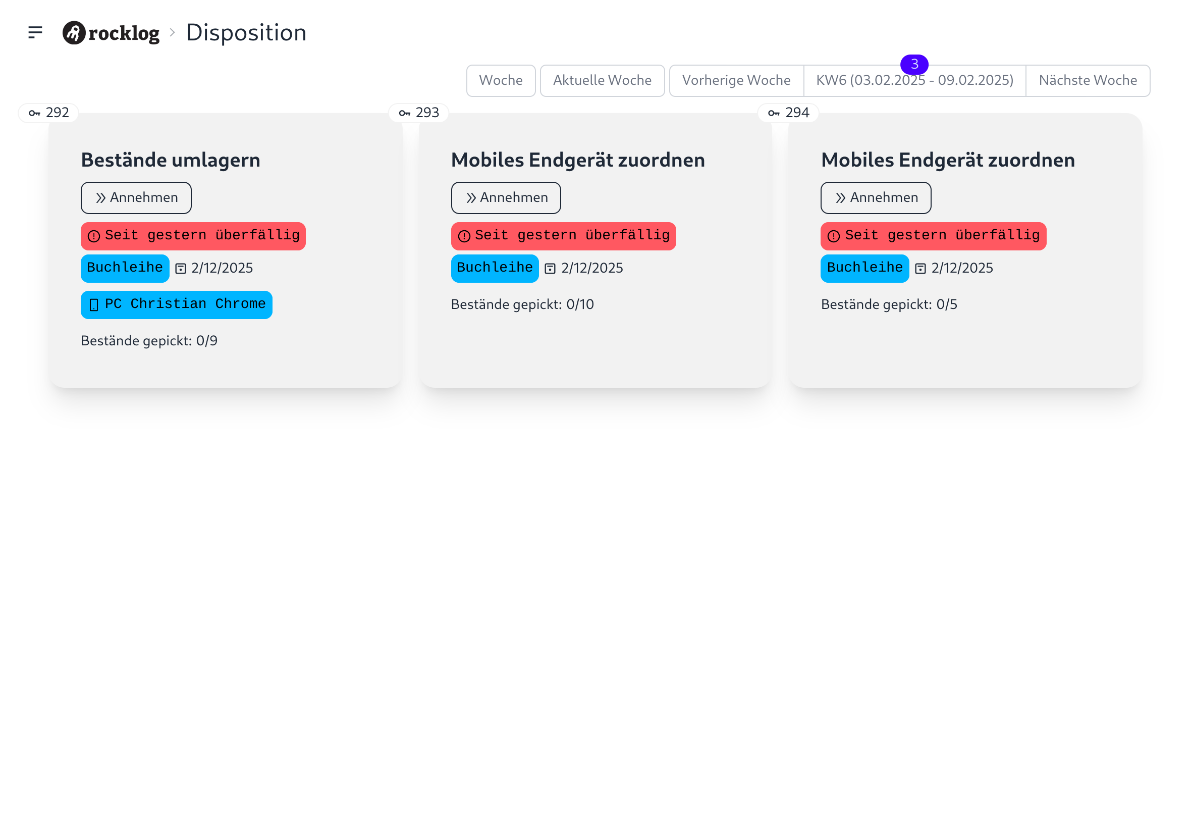 In der Zeitleiste, oben rechts, sieht man die Anzahl der offenen Aufträge über dem Datum. Mit einem Klick auf "Annehmen" ordnet man sein Endgerät dem Auftrag zu und der eigentliche Auftrag mit den zu Pickenden Büchern öffnet sich. Mit einem Klick auf "Entnahme bestätigen" (2x Klicken) wird dieses Buch als entnommen bestätigt und wechselt in den Status "Grün".