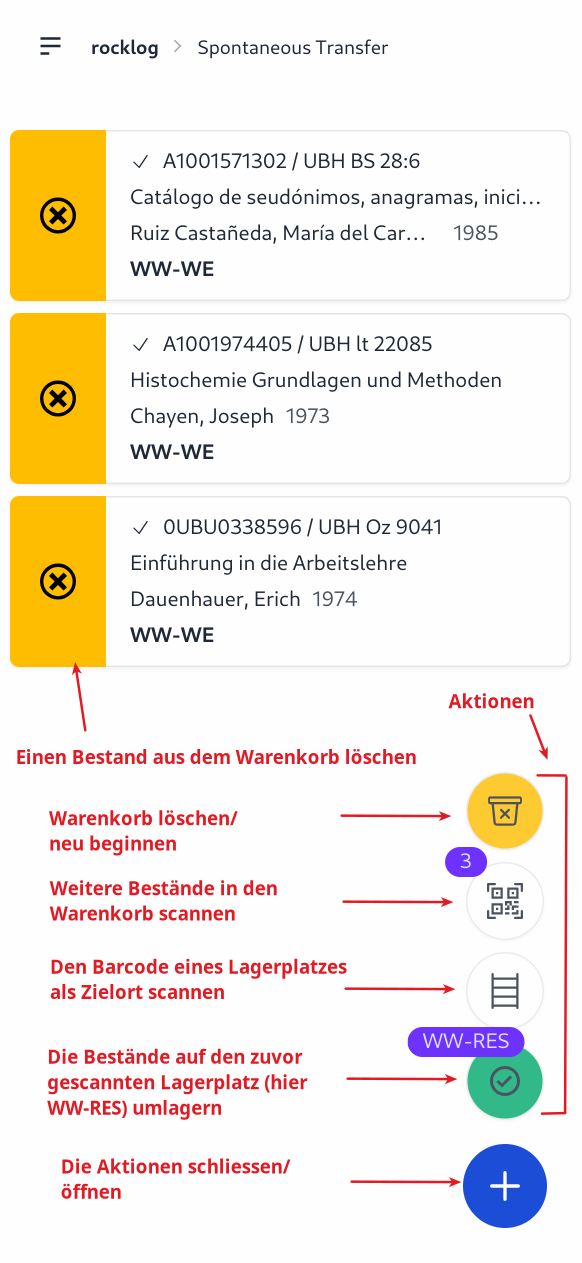 In der Listenansicht kann der Warenkorb mit den eingescannten Büchern komplett gelöscht, respektive einzelne Bücher aus dem Warenkorb entfernt werden. Hier erfolgt auch der Scan von neuen Büchern zum Warenkorb oder der Scan des Lagerplatzes als Zielort.